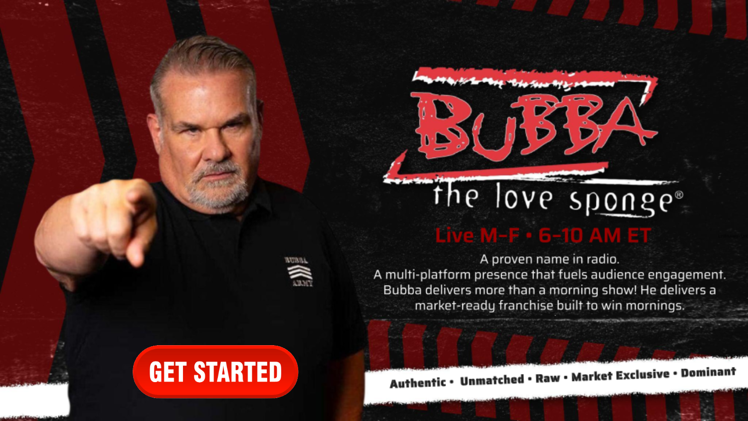 Built on decades of radio success, Bubba has retooled his brand for a new media era while keeping morning radio at the center of everything he does. His voice, influence, and audience loyalty now extend beyond the studio through an active social presence that fuels engagement, promotion, and daily tune-in. This is Bubba at full strength, modernized, amplified, and built to win mornings for FM stations ready to lead their markets.